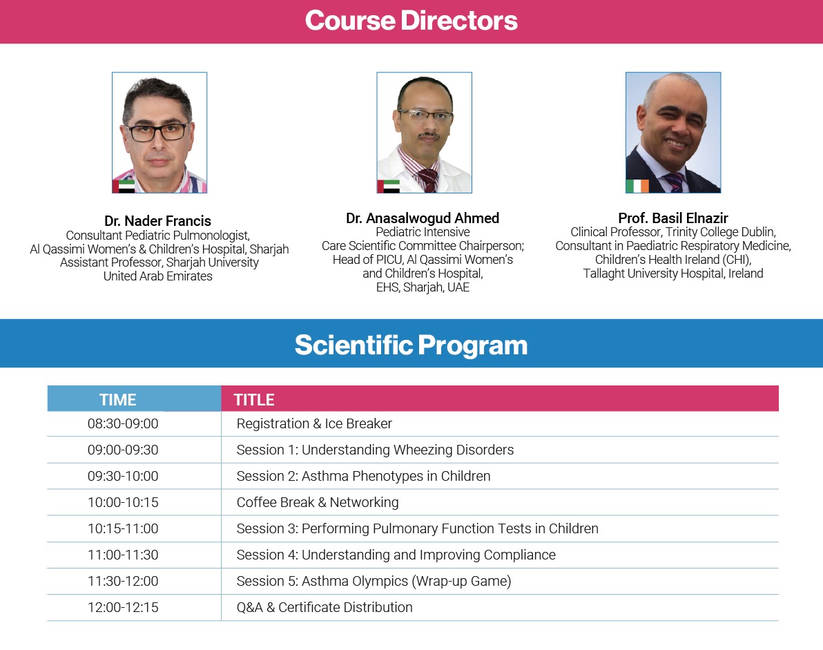 This workshop provides clinicians with updated knowledge and practical skills in the diagnosis, management, and prevention of pediatric asthma and wheezing disorders. Emphasis will be placed on guideline-based therapy through a mix of case studies, interactive demonstrations, and Q&A sessions, participants will gain practical skills for acute care and long-term disease control.